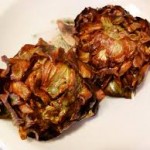 2. 2 schiacciare i carciofi con la punta in basso; disporli in questa maniera in una teglia dopo averle guarniti con prezzemolo ed aglio finemente tritati; aggiungere l’olio e 2 / 3 tazze d’acqua.